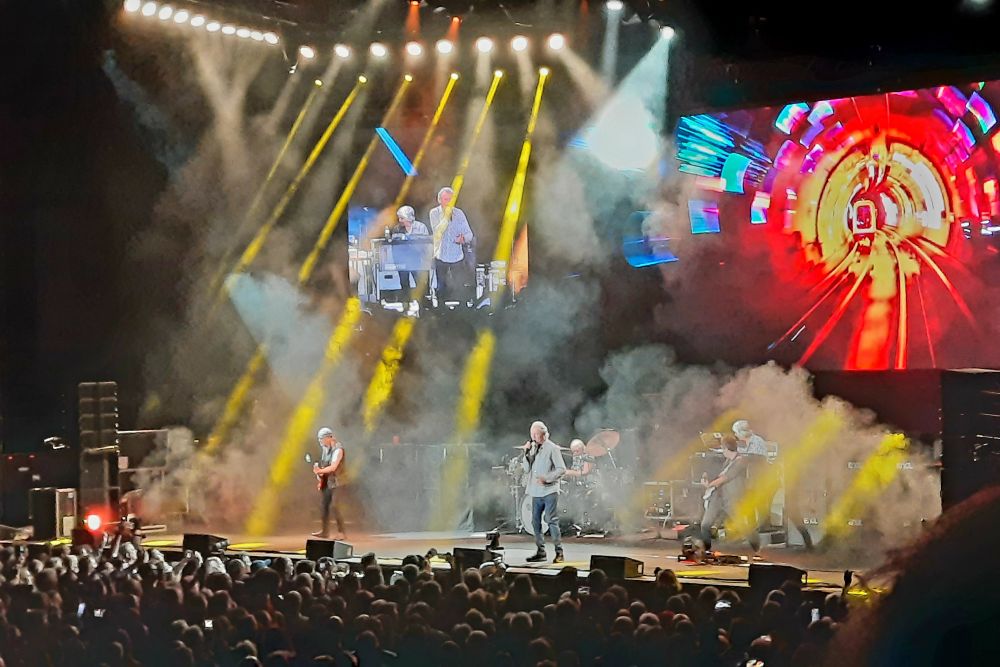 Um kurz nach 21 Uhr kann es dann endlich richtig losgehen und – man mag es kaum glauben: „Highway Star“ ist der Opener, exakt wie vor 35 Jahren in Dortmund. Man hat zwar den Eindruck, dass das Tempo auf diesem Highway gegenüber damals ein wenig gedrosselt ist, aber ansonsten sind sie wieder da: Roger Glover am Bass und Ian Paice am Schlagzeug sorgen für Druck und Ian Gillans Stimme klingt für seine mittlerweile 77 Jahre noch überraschend kraftvoll. Der 2012 verstorbene Jon Lord hatte bereits vor 20 Jahren die Tasteninstrumente an Don Airey weitergereicht, Youngster Simon McBride (Jg. 1979) hingegen ist ein ganz frischer Neuzugang an der Gitarre, seit Steve Morse in diesem Jahr seinen Ausstieg aus der Band erklärt hat. Deep Purple kommen ohne großes Bühnenbild aus, alle Instrumente sind ebenerdig und gleichwertig aufgestellt, drei Leinwände transportieren Detailfülle. Im Fall des unter den Achseln tief ausgeschnittenen Shirts von Ian Paice, der in diesem Outfit hinter seinem Drumkit wirkt wie ein britischer Trucker auf dem Weg zur Fähre, hätte man vielleicht gerne auf die hohe Auflösung verzichtet. Aber Don Airey schaut man beim beeindruckenden Keyboardspiel gerne auf die im Zoom überraschend wurstig wirkenden und dennoch flinken Finger. Auch Ian Gillan sieht man in Nahaufnahme die Anstrengung an, die hohen Töne zu treffen. Aber seine Mimik verrät auch, mit welcher Leidenschaft er immer noch Musik macht. Klar, eine stimmliche Herausforderung wie „Child in Time“ steht nicht mehr auf der Setlist und die Vocals duellieren sich nicht mehr mit Gitarre und Orgel, aber das tut der Energie insgesamt keinen Abbruch.
