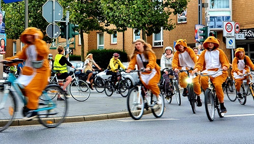 Denn unter den etwa 300 Teilnehmern bildete sich eine bunte Vielfalt ab: junge und alte Menschen, Männer und Frauen, Kinder und Senioren; Klappräder, Mountainbikes, Hollandräder, Pedelecs und Lastenräder fuhren einmal rings um die Innenstadt. Einige Demonstrationsteilnehmer waren verkleidet: Preise winkten für die besten Kostüme.
