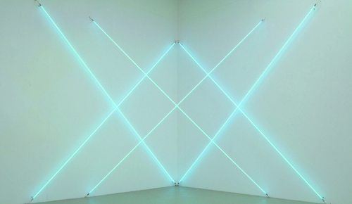 Aber die enorme skulpturale Wirkung zeigt sich gerade in den großformatigen Werken der Ausstellung. Mit den Leuchtstoffröhren „zeichnet“ Morellet geometrische Elemente wie Geraden oder Kreisbögen in den Raum. Die sechs, jeweils 450 cm langen blauen Neonröhren von „Triple X neonly“ (2012) entwickeln ein leuchtendes Gitter, das sich je nach Standpunkt zu einem mehr oder weniger geordneten Liniengeflecht verdichtet. Aber Morellet arbeitet auch mit dem rechteckigen Bildträger und der Linie, so besteht „Trop plein n°1“ (2013) aus zwei Leinwänden, auf denen jeweils eine blaue Argonröhre fixiert ist. In „Cercle à demi libéré n°2“ (2015) seiner jüngsten Arbeit, die in der Galerie gezeigt wird, löst Morellet die geschlossene, ruhige Form des Kreises zugunsten eines dynamischen Gefüges aneinander gesetzter Kreisfragmente auf. Und Morellet muss gesehen werden, eine Beschreibung von Lichtobjekten bleibt immer nur Makulatur, wird nie sinnliche Oberfläche.