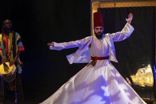 Die Wand mit Tür ist längst wieder nach hinten gewandert, schafft Raum für den Syrer Mohammad „Saado“ Kharouf, der sich im spirituellen Ritual der Derwische dreht und seine Brüder in Aleppo vermisst. Für ihn ist Deutschland ein Papier- und ein Kaltland. Die beiden Frauen im Ensemble amüsieren auch Sprache und Wesen der Deutschen. Pia Miranda, die Posaunistin aus Chile, macht das am diffizilen Wort „ineffizient“ fest, Majela van der Heusen aus Kuba eher an der männlichen Verklemmtheit. Aber die Truppe stellt auch fest, dass zu viel Reden nicht gut sei und grooven mit den Deutschen lieber in den Sonnenuntergang.