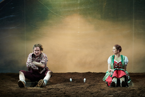 Otto (Stefan Walz) hat die erste missglückte Kopulation mit Ehefrau Hilde (Maresa Lühle) beendet und muss maulend im zweiten Loch zur Selbstbefriedigung greifen, da schnellt auch schon der Schachtelteufel Fritz aus dem dritten Loch. Der Exhibitionist kommt aus dem Gefängnis, muss ständig Psychopharmaka schlucken und ist dankbar als gärtnerische Hilfskraft bei Schwester und Schwager unterzukommen. Wer noch nicht weiß worum es geht: Das schier zeitlose Stück „Der Drang“ von Franz Xaver Kroetz im Wuppertaler Theater am Engelsgarten zelebriert das Leben in der Friedhofsgärtnerei im Wuppertaler Theater am Engelsgarten eben auf einer dünnen Torfschicht mit vier Löchern. Regisseur Peter Wallgram hat es im Großen und Ganzen beim volkstümlichen Ur-Fritz belassen, zu viel Klamauk schadet, denn hier gibt es am Schluss keine Gewinner, nur Opfer oder besser Verlierer.