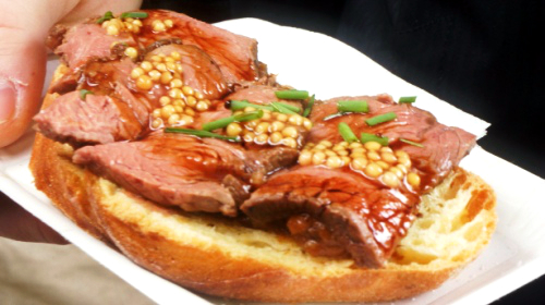 Heimlicher Favorit vieler Besucher war das Cidre-Steak vom Stand Comptoir du Cidre. Was rein optisch lediglich wie eine Scheibe Brot mit Fleisch wirkt, verspricht einen Ausflug in kulinarisch unerforschte Gebiete. Das Fleisch wird 24 Stunden in Cidre eingelegt und 11 Stunden im Vakuum gegart, bevor es mit 30 Stunden karamellisierten Zwiebeln auf selbstgemachtem Kartoffelbrot serviert wird. Bei all der kreativen Fleischeslust mussten aber auch Vegetarier und Veganer nicht verzweifeln, denn viele Stände boten vegane Gerichte an oder hatten sich sogar auf die fleischlose Küche spezialisiert.