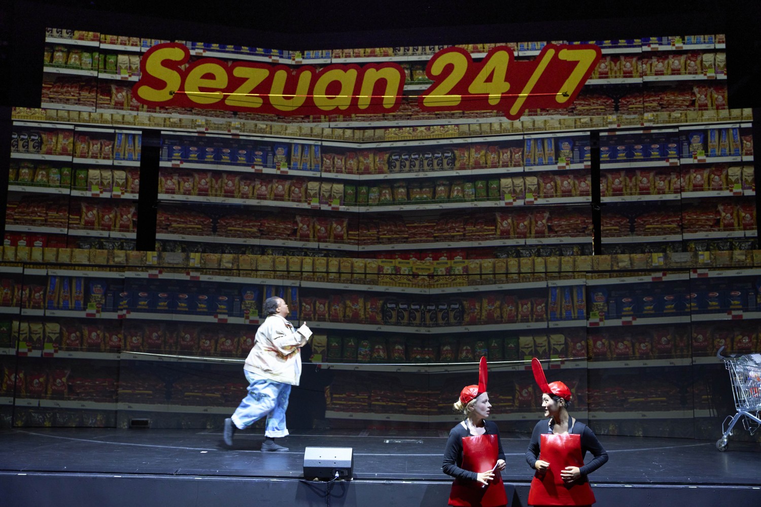 Die Götter sitzen bereits im Theatersaal, noch bevor diese Theaterpremiere beginnt. Auch Samantha Ritzingers Wasserverkäufer Wang agiert mit einem Einkaufswagen voller Pfandflaschen bereits auf der Bühne, während die letzten Besucher:innen noch ihre Plätze suchen. Wang bittet das Publikum, sich nach links oder rechts umzublicken. Bis sich Hân Nguyên und Lene Dax in roten Latexschürzen und ebenso knalligen XXL-Caps als Götter zu erkennen geben. Im Parabelstück „Der gute Mensch von Sezuan“, das Bertolt Brecht unter der Mitarbeit von Ruth Berlau und Margarete Steffin verfasste, zieht es diese überirdischen Wesen auf die Erde, weil sie einen guten Menschen inmitten des egoistischen und ausbeuterischen Treibens suchen, einen, der ihnen Obdach gewährt.