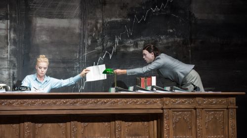 Ihre Gegenspielerin Rachel (Bettina Engelhardt) kann das nicht und darunter leidet Gorkis Dauerbrenner enorm, den Jan Neumann in einem großartigen Bühnenbild von Daniel Angermayr in den Bochumer Kammerspielen inszenierte und damit behutsam in eine Nichtzeit versetzte. Zentraler Punkt ist ein überdimensionierter Schreibtisch mit scheinbarem Eigenleben, hinter dem die Chefin thront und vor dem sich der Rest zu erniedrigen hat.