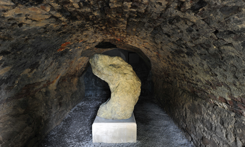 Am frühen Morgen ist es schön im Schlosspark vom Haus Weitmar, die Vögel zwitschern, Radwanderer ruhen im Schatten der Sylvesterkapelle. Hier, wo früher die Eleven der leider untergegangenen Bochumer Schauspielschule immer Open-Air-Shakespeare gaben, hier dreht sich nun hinter gläserner Tür der bronzene Erdnussflip des britischen Künstlers William G. Tucker (81). Sein verwirrender Titel „Prow“ (2010), was eigentlich einen Schiffsbug bezeichnet. Danach sieht das krüsselige Ding aber erst einmal nicht aus, das sich da – angestrahlt von zwei Lichtern – endlos auf dem Beton-Quader in einem schmalen Mauertunnel (eigentlich romanisches Tonnengewölbe) dreht. Ist dies der einstige Zugang zum ehemaligen zerbombten Reliquienschrein (Krypta) der Schlosskapelle oder die Grabkammer? – und sowieso war der doch längst verschlossen. Für die Dauerleihgabe des eigentlichen Hausherrn Alexander von Berswordt-Wallrabe an die Stiftung Situation Kunst der Ruhr-Universität wurde der Gang wieder geöffnet und für ein paar Euro (25.000) hergerichtet.