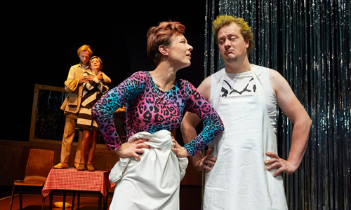 Im Bochumer Prinz-Regent-Theater inszeniert Theaterchefin Romy Schmidt ihre Version des Fassbinderschen Antitheaters, nicht Films, denn was nicht viele wissen, der Text vom Theaterstück stammt vom Deutschen Meister (1945-1982) des Neuen Deutschen Films selber. Hölle, Hölle, Hölle. Das ist ja Wahnsinn und der alte Wolfgang Petry wird auch irgendwie der Running gag und ein klitzebisschen Stilbildner des Abends, der mit den szenischen Brüchen einer Revue nicht nur die Situation des ungleichen Paares lockert, nein der Abend zeigt eine neue Definition des eigentlich verpönten Mitmachtheaters. Romy Schmidt und Frank Weiß geben dem Publikum die überaus zeitgenössische Möglichkeit, während des Stücks, Text, Dialoge und Protagonisten zu dissen. Unter den Sitzen findet sich natürlich kein Facebook-„Gefällt mir nicht“-Button, aber plüschige Flaschen, Bananen und Haie können mittendrin geworfen werden, Unmutsbekundungen wie „buh“ und spitze Schreie sind erlaubt. Anne Hofmann und Maximilian Stresnik übernehmen diesen Schau-Teil, der auch mit seiner grenzenlosen Trivialität besticht. Dass dies auch ein Reflex auf Publikum-beherrschende TV-Formate ist, mag man nicht einmal mehr bemerken. Das Showmaster-Pärchen, das sich quer durchs gesamte Theater bewegt, wird immer von einem hörbaren Schalter abgewürgt, die eigentliche Handlung beginnt zwischen silbrigen Fadenvorhängen und Spiegelflächen, in denen sich auch die Zuschauer wiedererkennen können.