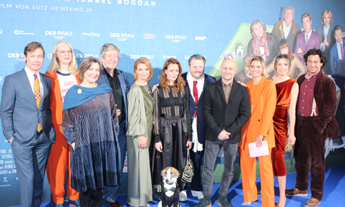 Gruppenbild mit Hund: Die Darsteller und der Regisseur von "Der Pfau" im Cinedom