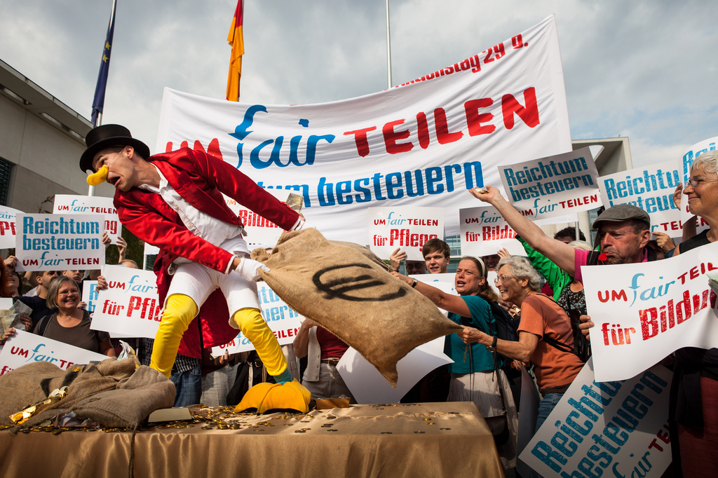 Deshalb fordert Umfairteilen eine Vermögensteuer und eine einmalige Vermögensabgabe, um die notwendigen öffentlichen und sozialen Ausgaben gerecht zu finanzieren und die Verschuldung abzubauen. Das Bündnis kämpft außerdem gegen Steuerflucht und Steueroasen, für eine Steuer auf Finanzmarktgeschäfte, gegen die Spekulation und gegen weltweite Armut.