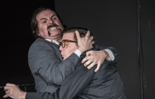 Warten ist pure Mystik: Ob wir für den Bus oder das Jenseits anstehen – im Warten dehnt sich die Zeit und macht uns empfänglich für übersinnliche Erfahrungen. Das gilt auch für die beiden Killer Gus und Pete in Harold Pinters „Der stumme Diener“, die todbringenden Bereitschaftsdienst haben. Wie so oft haben sie sich in einem Zimmer eingefunden, um auf den telefonisch übermittelnden Einsatz zu warten. Pete (Jan Pröhl) hockt breitbeinig auf dem Stuhl. Anzug, Haare und Schnauzbart im Stil der Achtziger oder im Tarantino-Revival-Style (Bühne und Kostüme: Friederike Külpmann). Er liest den Corriere della Sera, als ob die Mafia intellektuell geworden wäre, interessiert sich aber nur für außergewöhnliche Unfälle und packt dementsprechend immer mal wieder eine Prügelattacke aus. Was Pete das Lesen, das ist Gus das Teekochen. Beides strukturiert Zeit. Gus (Stefan Diekmann) trägt zum Anzug Arbeitsstiefel – Modern ist schließlich Maloche. Wenn seine Gliedmaßen Entschlusskraft demonstrieren, kommt ihnen regelmäßig ein Gedanke als Hemmschuh dazwischen.