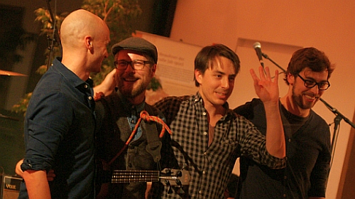 Und das wohlgemerkt nur in einem einzigen Song: Auf ihrem Album „Calm Seas don't Make Good Sailors“, mit dem sie den Abend bestritten, finden sich komische Musikmomente genau so wie ergreifende. Und immer schaffen es die Wahlhamburger, Bilder vor das innere Auge des Zuhörers zu zaubern, auch wenn Sänger Ben grad schweigt, und den Instrumentalisten das Feld überlässt: Der in der kuschligen Popnummer besungene „Slow Motion Man“ wird lebendig und stapft langsam, ganz langsam durch den Konzertraum, wenn Felix Hoffmann zur Klarinette greift.