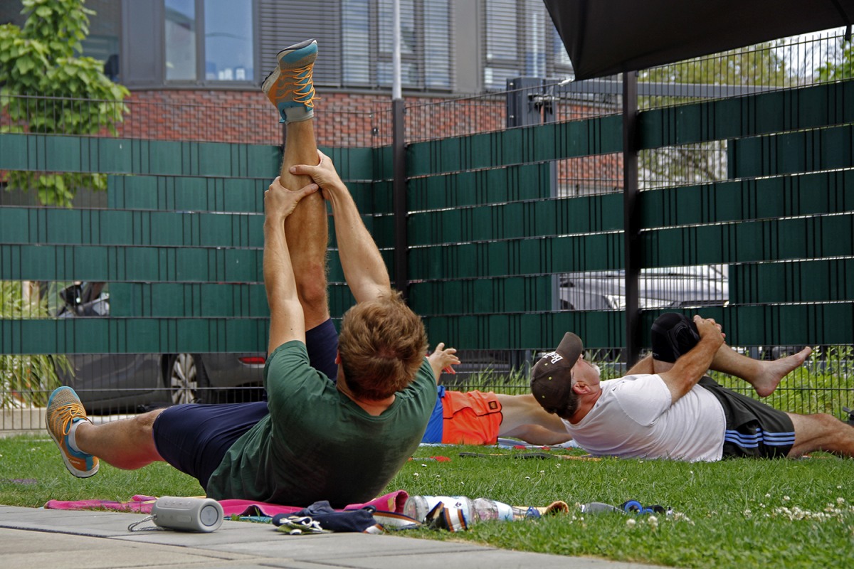 Hans-Dietrich Heimes hat Knieschmerzen. „Ich bin ein guter Tennisspieler“, sagt er. Der Dauerschmerz sei der Preis für die einseitigen Bewegungen. Seit er mit seiner Frau zum Intervalltraining des Vereins für Gesundheitssport und Sporttherapie Köln (VGS) gehe, könne er viel besser mit dem Schmerz umgehen. Der lasse anschließend deutlich nach, Heimes fühle sich belebt und beinahe „katzenhaft“. Außerdem mache der Kurs Spaß. Das merkt man an diesem Spätsommertag in Köln-Ehrenfeld, auf dem kleinen Rasengelände neben dem Vereinsgebäude. Die Frauen und Männer, die heute gekommen sind, wirken vertraut und lachen immer wieder während der Übungen. Endlich können sie wieder gemeinsam Sport machen, hier draußen oder in der vereinseigenen Sporthalle mit strengen Abstandsregeln und guter Durchlüftung.