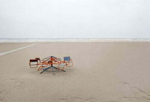 Zeitgenössische Fotografen, die als Ikonen der Fotografie gelten, kannten ihn und seine Arbeit. Denn er betrieb die Fotomontage nicht im Labor, sondern spürte sie in seiner Umgebung auf. Und das war schon in „Papplandschaften“ (1970-1973) einer frühen Serie so, wo sich Fotos in einer eigenen Landschaft behaupteten oder in eine für sie untypische Umgebung gebracht und dann neu fotografisch aufgearbeitet wurden. Aber immer waren die Orte Teil einer Peripherie, die sich entweder posturban dem eigenen Überleben widmen musste oder als ferner Urlaubsflutgraben bestehen wollte. Als finale Kardinalserie sei dafür die Serie „Atlas“ (1973) genannt, in der er die Reisen zu Orten selbst löschte, weil alle Wege längst gegangen, die Orte längst beschrieben und nur noch einzelne Zeichen einen Subtext generieren. Wunderbar und letzter Beweis die drei kleinen schwarzen Palmen auf einer Landkarte, deren Koordinaten keine Rolle mehr spielen.