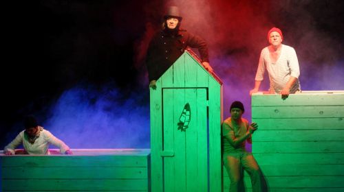 Vier hölzerne Umkleidekabinen und zwei Streifen, mehr ist erst mal nicht auf der Bühne im Dortmunder Depot-Theater. Die gekreuzten Striche sind der Äquator und der Greenwich-Meridian und damit ist für einen alten Segler klar: Das Stück spielt im Golf von Guinea. Dass es dort keine Inseln gibt, auf die sich vier Touristen verirren könnten, sei mal beiseite gelassen. Es ist schließlich eine Geschichte über den weißen Wal, den jeder kennt, und über Melvilles Kapitän Ahab mit dem klackernden Holzbein auf Deck. Das dürfte interessant werden, denn neben John Hustons 1956er Filmversion mit Gregory Peck kannte ich nur das Buch, und das war schon um Längengrade besser als der olle Zelluloid-Streifen.