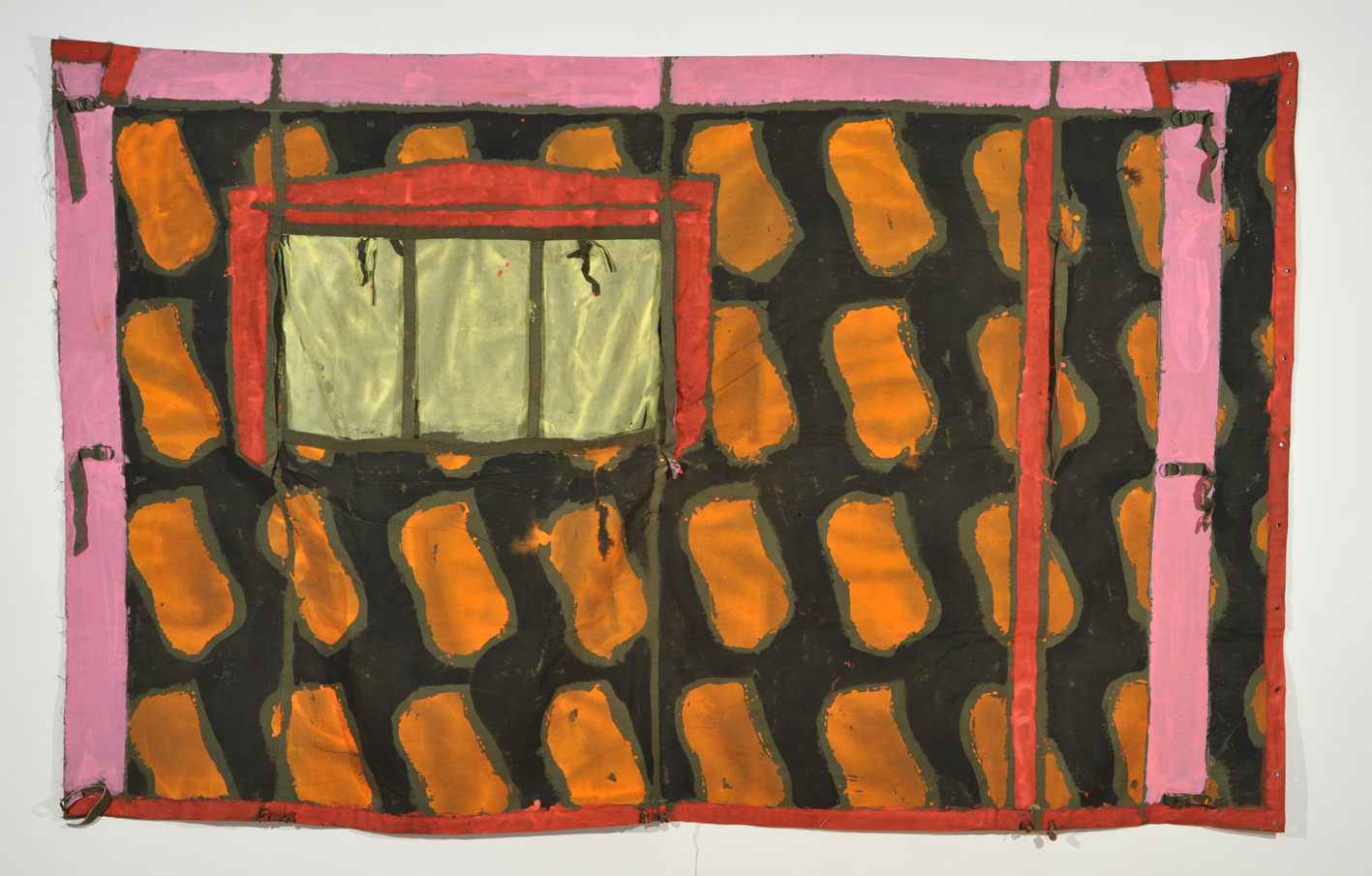Dabei sind die Werke alles andere als zugänglich. Sie verkörpern eher Haltung, als Handwerk, dienen als theoretische Matrize für den Künstler, der Malerei konsequent weitergedacht hat bis in ein gedachtes Nichts, das nur noch von Farbe, gleichen Formen und der Austauschbarkeit des Untergrunds lebt. Viallat malt Muster für Muster und dabei darf es gern auch mal ein industrieller Stoffmusterstreifen sein (Ohne Titel, n°447, 2007). Während der Künstler (77) international längst in vielen wichtigen Museumssammlungen vertreten ist, ist sein Werk in Deutschland noch nahezu unbekannt. Viallat, der als einer der wesentlichen Vertreter der französischen Support/ Surface-Bewegung gilt, wandte sich in den späten 1960ern von den konventionellen Möglichkeiten der Malerei ab, thematisierte die Malerei selbst – und entwickelte die bekannte amöbe Form-Spur, die sein Werk seit damals kennzeichnet und die bis heute seriell mit Hilfe von Schablonen aufgemalt wird. Dazu kam der Bildträger, „objet trouvès“, die er selbst fand oder geschenkt bekommt, in eine manchmal fast schon beliebig zu nennende Form bringt oder die ursprüngliche erhält, dann mit der informellen Formensprache versieht – fertig sind die malerischen Statements, deren Gleichrangigkeit von Material und Malerei den Reiz dieser Werke ausmacht. „Ich war auf der Suche nach Formen, die wenig Assoziationen hervorrufen“, wird Viallat zitiert, doch so einfach ist das offensichtlich nicht, denn die ursprüngliche Bedeutung des Maluntergrunds schwingt immer mit, bekommt manchmal ein Eigenleben, wie das ehemalige Militärzelt, die Segel oder mit Motiven bedruckte Stoffbahnen.