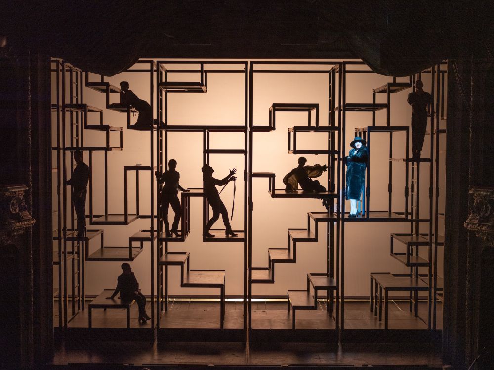 Doch die Berliner:innen rocken den letzten Tag, Tilo Nest als Bettlerkönig Peachum übernimmt zusätzlich den Part, wenn er Pause hat und wenn Brown und er einen Dialog haben, ja dann liest eben die Soufflage vom Blatt ab. Das ergibt ganz neue Perspektiven für die Inszenierung und ist fast schon ein bisschen Brecht himself. Tausendsassa Mackie Messer, gespielt vom unglaublichen Nico Holonics, der sogar noch Zeit hat, seine Späße mit dem gefledderten Zustand zu machen, während er schier atemlos auf den Straßen Sohos zum Galgen schlittert, hält den einmaligen Abend zusammen. Kosky hat das Stück eh wie ein Jahrmarkt-Ketten-Karussell um die zentrale Figur choreografiert und das auf einer Bühne, die manchmal an Elvis‘ „Jailhouse Rock“-Bau erinnert. Das verfliegt aber am Abend, denn die zeitlosen Gassenhauer erwarten einfach das Mitmurmeln unter der leichten OP-Maske. Anfangs dominiert noch der Glitzervorhang, später werden die riesigen, teils beweglichen dunklen Baugerüste die Bühne beherrschen oder sie wie eine Arena umrahmen.