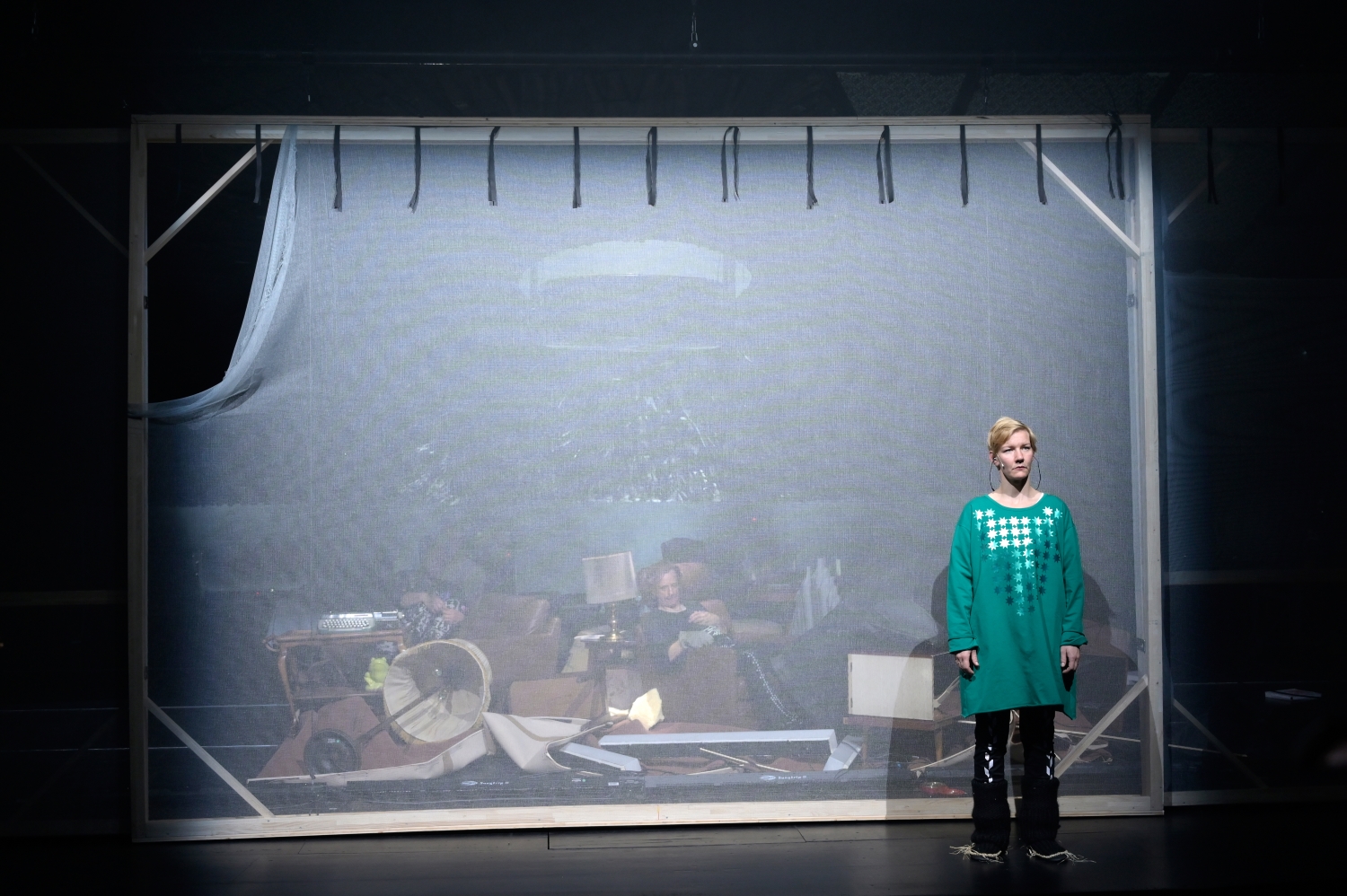 Dann setzten die Windmaschinen ein und lassen das installative Bühnenbild in sich zusammenkrachen, Nebel fliegt aus allen Richtungen, wo eben noch Herakles die Welt auf dem Kühlschrank stützte, kracht diese nun scheppernd zu Boden. Das Licht wirft blendende Strahlen durch die Zerstörung. Alle Protagonisten sitzen regungslos dazwischen. Neues kann nur aus dem Chaos entstehen? Der Geräuschpegel steigt in kaum erträgliche Feedbackschleifen, Inferno beim Versuch, die Götter wieder zu erreichen. Der Vorhang fällt, doch nicht der Mythos. Noch muss der Göttersohn in „Herakles 13“ durch den Wahnsinn, die Endzeitstimmung vor dem geschlossenen Vorhang legt sich wie ein dunkles Laken über die Zuhörer. Die formidable Sandra Hüller ist das fast beiläufige Medium, durch das Heiner Müllers Zerstörung des antiken Mythos in den Köpfen der Zuschauer Gestalt annehmen sollte. Das Schlachten steht wieder am Ende, oder wenn man denn so will, wie am Anfang einer neuen götterlosen Zeit. Das ist ein 75 Minuten-Abend, der die Welt nicht in den Abgrund reißt, dessen inhaltliche Rückkopplungen aber für neue Ansätze hilfreich sein können.