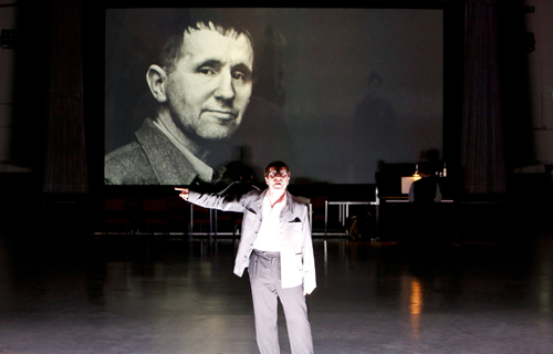 Und dafür steht der Autor Brecht erst einmal selbst auf der Bühne im DortmunderMegastore, die immer eher einem Fußballfeld gleicht. Aber Deutschland ist eben ein großes Land und der Brecht hat immer noch viel zu sagen, aber auch immer zu erklären. Episches Theater, das Modell derVerfremdung, politisches Theater, seine Pädagogik. Ja klar, Bertolt. Uwe Schmieder hat ihn sich angezogen, mächtig geschminkt, maskiert, Schmieder gekonnt mit Brille und dauerhaft brennender Zigarre, ein Tausendsassa, der im Laufe des Abend immer weiter in den Hintergrund tritt – seine Ideen bleiben. SA marschiert dafür mit festem Tritt ins weiche Rückgrat des Deutschen Volkes. Nochmal. SA marschiert dafür mit festem Tritt ins weiche Rückgrat des Deutschen Volkes. Nochmal. SA marschiert dafür mit festem Tritt ins weiche Rückgrat des Deutschen Volkes. Das nennt Brecht „Die Wiederholung wichtiger Fakten“ und dient als Stilmittel auf politischen Bühnen und damit sich auch Wutbürger das merken können.Hawemann nutzt das auch bei seiner Auswahl aus den ursprünglich 24 Szenen (insgesamt sind heute sogar 30 bekannt) des Stücks (uraufgeführt 1945 im Exil in den USA).