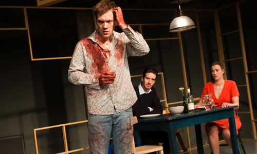 Der Blick ist vergittert, von Beginn an. Danny und Helen samt Sohn wohnen in einem so genannten Problemviertel. Die Miete ist billig, das Milieu wenig bürgerlich, aber die „Verkehrsanbindung ist gut“. So kompensiert man den eigenen sozialen Abstieg mit der vermeintlichen gesellschaftlichen Teilhabe via ÖPNV. Die Zimmereinrichtung auf dem Spielpodest im Bochumer Theater unten mit Tisch und Stühlen wirkt zusammengewürfelt, eher geschenkt als erworben. Umstellt ist die Spielfläche von einem kunstvollen Gitter aus verschieden großen Holzrahmen. Es ist ein verstellter, ein geschützter Blick, den die Figuren nach draußen, den die Zuschauer von drei Seiten auf die Protagonisten werfen. In diese lädierte Idylle platzt der junge Liam. Platzt mit blutverschmiertem Hemd mitten ins feierliche Essen von Schwester und Schwager. Ein brachialer Realitätsschock. Doch Liam garniert ihn mit humanitätsduseligen Floskeln, die als bürgerlich-humanistisches Streusalz auf der abschüssigen Mittelstandsebene zunächst Wunder wirken.