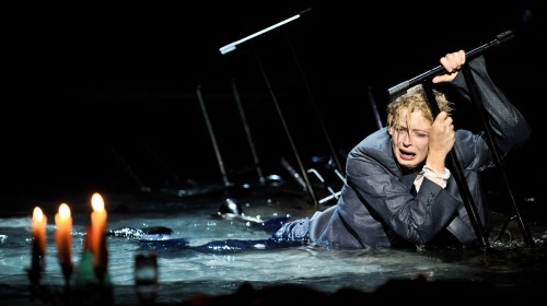 Auf der Forellenteichbühne mit ihren drei Wasserbecken unter einem Glühbirnenfischernetz wird (allzu) ausgiebig geplanscht. Einer muss immer in die Brühe. Meist erwischt es das Komikertrio Bleichenwang (Florian Lange), Toby Rülp (Matthias Redlhammer) und Zofe Maria (Friederike Becht), die ausdauernd „Weißer Hai“ spielen, Duelle fingieren oder sich versehentlich zum Schein ertränken. Vor allem die Intrige gegen Malvolio wird zu einem Höhepunkt der Komik, umso mehr, weil Martin Horn ihn als extrem schlechtgelaunten Butler gibt. Als Gegengewicht zum Irrwitz dieser Viererbande verschärft Regisseur Roger Vontobel die Camouflage der Hauptfigur zu einem schweren Identitätskonflikt. Die androgyne Jana Schulz als Viola zeigt die geschlechtliche Zerrissenheit als existenzielle Lebenskrise zwischen den Polen des Weiblichen und Männlichen. Ein Konflikt, der durch die geschlechtliche Rollenzuweisung der anderen sich noch verschärft. Vontobel macht dies nicht nur dadurch deutlich, dass er Viola immer wieder Statisten an die Seite stellt, die sie als Braut und als jungen Mann zeigen; Jana Schulz spielt auch Violas verschollenen Zwillingsbruder Sebastian, der damit zu ihrem Alter Ego wird. Es sind gerade die Übergänge, die Verwandlung der Figuren zwischen den Identitäten, die Vontobel mit verwirrender Brillanz gelingen. Die Komödie mündet so allmählich in eine Tragödie. „Du sollst so sein, wie ich dich haben will“, schreien am Ende alle Viola ins Gesicht und zerren an ihr herum, bis sie tot ins Wasser sinkt.