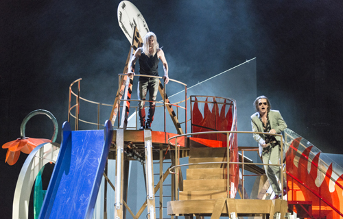 Aber alle werden die Trümmer ins Nichts hinüber tragen, ohne viele Streichungen. Ein Glatzen-Faust erscheint irgendwo oben auf der Spielfläche. Ein Geländer verhindert seinen Sturz, eine blaue Kinder-Rutsche führt an die Rampe – das Bühnenbild (Janina Audick) ist schon gewöhnungsbedürftig, der Höllenspektakelsperrmüll dreht sich auch, wird zum Background für Livevideobilder, die das Geschehen optisch wie ein Triptychon umrahmen, umgarnen. Entlarven? Das ist jetzt nicht der Einfall letzter Schrei, doch hat die Mixtur schon einen gewissen Reiz, langweilig wird es jedenfalls nie. Faust hastet durch seinen Studierzimmertext, sehr lustig dazwischen Anja Schweitzer als nervige Famulus Wagner-Karikatur. Alle Texte sprudeln, doch eine wichtige Hälfte verschlingt die ständige Bewegung, auch mal ein Vocoder, die Dauerchoreografie – immer neue Bilder sind der Regie und Dramaturgie wichtig, der Flow ist Pedro Martins Beja anscheinend noch wichtiger. Erdgeist. Nacht. Der Teufel lacht, verworren sind die Wege, die der Faust nun macht. Alles bewegt sich wie auf einem Surface für Videospiele. Der alte Wissenschaftler ist mit seinem Latein am Ende, das er im Schierlingsbecher herbeisehnt, da tritt der deutsche Chor herbei: „Christ ist erstanden“ – ein Kreuz leuchtet, und schon lässt Faust den Giftbecher stehen. Deal. Die Überheblichkeit trotzt grinsend dem gewitzten Altrocker.