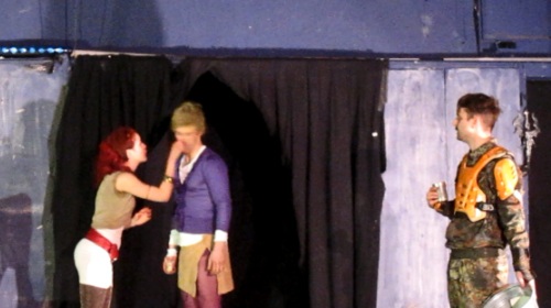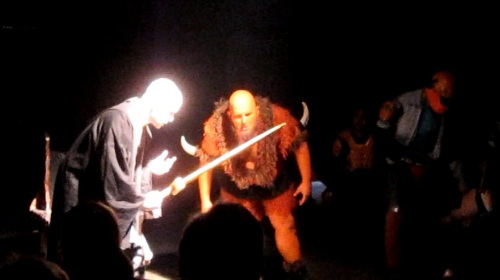 Das aus dem Umfeld der Ruhr-Uni Bochum entstandene Phalanx-Ensemble trat im Vergleich zur ursprünglichen Besetzung leicht verändert auf, vor allem bei den Heldinnen der Zunft fügten sich die neuen Gesichter von Teela und She-Ra bestens in die eingespielte Truppe ein. Es war interessant zu sehen, wie das Stück, bisher vor allem auf der größeren Bühne im Musischen Zentrum erprobt, auf den wenigen Beton-Quadratmetern der Rottstr.5 mit direktem Kontakt zum Publikum funktionieren würde. Wie sich zeigen sollte schadete dieser Umstand der Aufführung keineswegs, im Gegenteil wähnte sich der Zuschauer noch viel stärker mitten drin in der vor allem vom Engagement der Schauspieler lebendig gemachten Fantasiewelt Eternia. Die dunkle Halle mit darüberher-ratternden Zügen vermittelte stellenweise gar das Gefühl, man befinde sich in den Höhlengemächern des Herren der Unterwelt. Allzu finster war die Stimmung dann freilich doch nicht, dafür sorgten schon die witzigen Dialoge. Die Inhalte der beliebten Cartoon-, Hörspiel- und Spielzeugserie aus den 80er Jahren vermischte Autor und Regiesseur D.H. Freeman mit Zitaten aus Trash-, Pop-, und Alltagskultur. So sorgten Anekdoten aus dem Uni-Alltag (Beast-Man wird nicht in die Bibliothek von Snake Mountain gelassen, weil er die 2€-Münze für das Schließfach vergessen hat), sexuell-pornographische Anspielungen (Teela trainiert Fistos Kampffaust) oder Alkohol-bezogene Eskapaden (Das 20-Liter-Pinnchen als Man-at-Arms‘ neueste Technologie-Innovation) für viel Heiterkeit beim gut aufgelegten, überwiegend jungen Publikum. Das die derart durch den Kakao gezogenen früheren Spielzeug-Helden dennoch angemessen gewürdigt wurden, war nicht zuletzt an den ansprechenden und in vielen Details liebevoll gestalteten Kostümen zu erkennen.