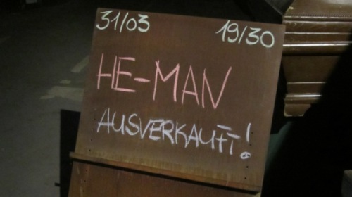 Die Meister des Universums hatten am Ostersonntag (31.3.) zu einem Gastspiel in die Rottstraße geladen und konnten sich über mangelnde Nachfrage wahrlich nicht beklagen. Mit Enttäuschung mussten die zu spät Gekommenen die Nachricht „ausverkauft“ aufnehmen und wieder von dannen ziehen. Ca. 80 privilegierte Zuschauer hingegen durften bleiben und das vergnügliche Action-Spektakel um He-Man und Skeletor verfolgen, viele von ihnen sicher nicht zum ersten Mal. Sogar der Inhaber des örtlichen Comic-Ladens adelete das Phalanx Theater mit seinem Besuch.