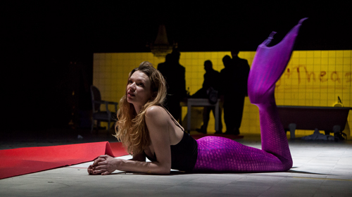 Hysterie bestimmt das Wesen dieser norwegischen Kunstfiguren. Alles ist irgendwie auch Lüge. Sie belügen sich wissentlich, haben aber weder ihre Sprache, noch ihre Gesten unter Kontrolle. Am schlimmsten ist ihr inneres Wesen, es kehrt sich nach außen, es wimmert, es muss in Handtaschen beißen oder an anderen Körpern riechen. Dann schleppt sich Lise Wolle mit ihrem langen Fischschwanz herein, kriecht durch drei Zimmer, trinkt aus der Toilette und landet auf einem Klinikbett im hintersten Neonlicht-Winkel – hier wird ihr von Jörgen wortlos der Schwanz entfernt und richtige Beine angebracht. Ein Raum mit einer Batterie Waschbecken und Pissoirs. Dann sieht man sie lasziv über einem Sessel hängen, sie würgt sich, bis sie luftschnappend am Boden liegt: Hallo Tante Juju. Hallo Hedda Tesman. Nichts ist so normal wie diese Gesellschaft. Regisseurin Kitsopoulou hält das Tempo und die Choreo hoch, manchmal wirken die Ideen zu spaßbetont, Ibsen kurz konterkariert mit Boulevardbühnenklamauk, dann wird‘s wieder so brutal artifiziell. Marilyn Monroe nackt in der Badewanne. Hedda in der Uniform des Vaters, mit seiner Pistole. Mit ihr wird sie ihren Ex Ejlert Løvborg der unvermittelt ihren Wohlstand bedroht in den Selbstmord treiben. Ist es der ersehnte Wohlstand, der sie in diese Lage gebracht hat? Das Bild trügt. Sie ist nur eine Fiktion aus der Vergangenheit: „Ich bin eingesperrt in 1890. Mein Salon ist mein Sarg.“ Das kotzt sie an – all diese Noras und all diese Dreiecksgeschichten. Alte Männer mit Schwanzproblemen. Doch diese Dämonen sind wehrhaft. MeisterIbsen himself erschießt Hedda am Schluss in der Badewanne, hinter einem danach blutüberströmten Vorhang zu Misirlou & Surf Riders Pulp Fiction-Theme. Kein Wunder es ist eine Pistolenkugelorgie.„Ich hab gesagt: verdammt nochmal! Verdammt nochmal... verdammt!“ Genau. Super Kunstkacke.