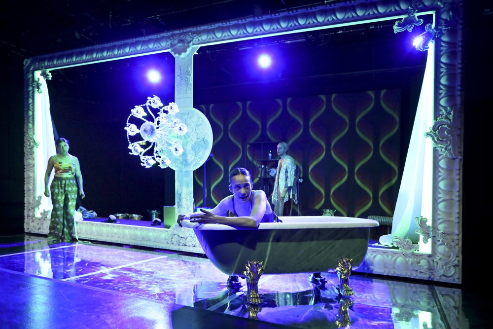 Das erste Menschlein im Pferderennen um Erfolg ist eine junge Frau (Valentina Schüler), die sich auf dem silbernen Dancefloor windet. Anspruch und Wirklichkeit sind aus den Fugen geraten, dennoch verlässt sie erschöpft ihre Therapiesitzung und findet sich im Alptraum ihrer gequälten Psyche wieder, die Welt versinkt in ein drohendes Szenario: Das Universum wartet in der Inbox, die Qualen scheinen real zu werden, eine Eruption der Gefühle. Paul Spittler inszeniert den Kapitalismus-Horror fokussiert auf ein kleines Setting, das sich im Laufe des Abends geschickt nach hinten öffnet und im Castorfschen Sinne dem Zuschauer verborgene Räume durch Live-Kameras öffnet. Eine durchgehende Choreografie unterstützt in der ersten Stunde die dialoglose Erzählung der drei Nosferatu-Protagonisten.