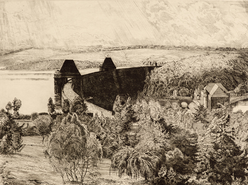Eine kleine Auswahl seiner schier endlosen Landschaftsdarstellungen bildet den Mittelpunkt der Kabinettausstellung im Museum Folkwang. Optisch öffnet sich der Blick vom frühen Selbstbildnis (Radierung und Kaltnadel, 1915) in der Mitte nach rechts und links zu frühen Arbeiten Kätelhöns in Essen und zu Werken des Zeichners und Druckgrafikers Adrian Zingg (1734-1816), der als Beleg für die traditionelle Bildgestaltung der Landschaften (Ansicht von St. Blasien im Schwarzwald, Feder und Pinsel, Grisaille 1790) mit gezeigt wird. Im Raum dahinter hängen als Kontrast aber auch einige neusachliche Industriefotografien von Albert Renger-Patzsch (1897-1966), die zeitlich parallel im Ruhrgebiet entstanden sind und ein so anderes Bild der Industrielandschaft zeigen (Gartenkolonie im Industriegebiet Bochum, Silbergelatineabzug, 1930).