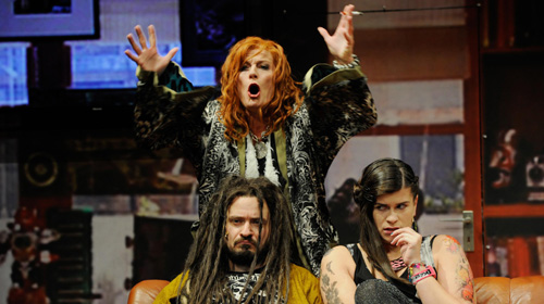 Ohne Familie geht gar nichts. Nicht mal Big Data, denn der ist ein riesiger babyhafter rosafarbener Wonneproppen mit blonder Tolle (Jan Pröhl). Das Handy vorm Gesicht wie ein Datenansaugstutzen zerlegt er die ganze Familie in Algorithmen. Vor allem seinen Vater Jaron (Daniel Christensen), den angefetteten Rastaman und früheren Open-Source-Visionär – unverkennbar eine Parodie auf Jaron Lanier –, den Google und Kollegen längst aufs sozialträumerische Abstellgleis geschoben haben. Ines Krug als Big Datas Mutter ist die Inkarnation der Trailer-Park-Schnalle, Zigarette im Mundwinkel, Kittelschürze und Rumgekeife, während Tattoo-Tanktop-Töchterchen Lisa (Lisa Henrici) die naive Facebookenthusiastin gibt.