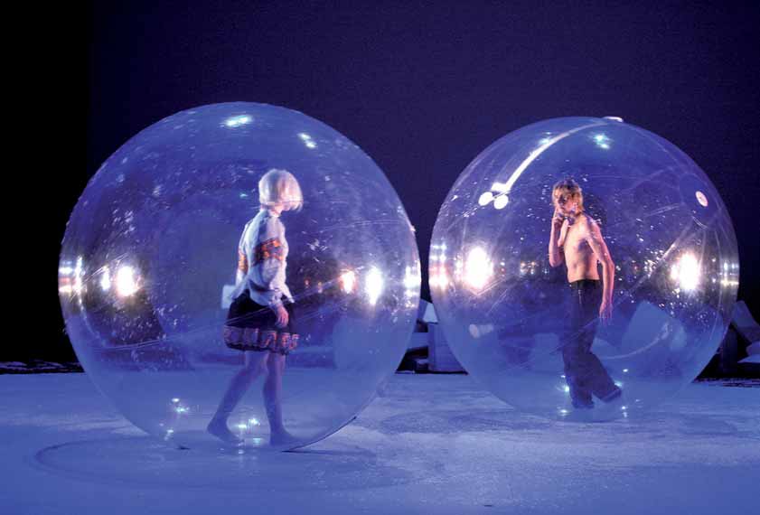 Das heißt natürlich nicht, dass die Satire und Sozialkritik Georg Büchners bei diesem visuellen Bombardement vollends auf der Strecke bleibt. Die Forderung nach Voll-Arbeitslosigkeit für geschmackvollen Müßiggang konnte der Autor in seiner Zeit zwar noch nicht formulieren, auch die Halbtages-Reise durch die damaligen zahllosen Fürstentümer, ein halbes Dutzend Großherzogtümer und ein paar Königreiche ist heute in Deutschland nicht mehr möglich. Deshalb hat Anna Bergmann die Flucht der beiden vor der Hochzeit nicht nach Italien, sondern an den Südpol verlegt. Die Videoleinwand zeigt im Hintergrund Pinguine und Nordlichter. Die Drehbühne wird zur splitterglatten Eisfläche, auf der die Personen ihre stolpernden Bahnen ziehen müssen. Trotz der eigentlichen Leere ist auch hier die Choreografie ausgefeilt und stimmig. Leonce will sich im Schneegestö - ber das Leben erfrieren, doch Valerio rettet ihn in ein Iglu. Das Paar kann sich also finden, ohne sich zu kennen.