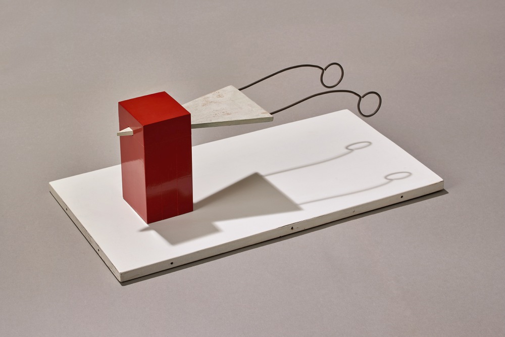 Die Treppe hinab zur Ausstellung führt direkt schon auf drei Hingucker zu, die unterschiedlichen Zeitgeist repräsentieren. Links Zimmermanns knallbuntes „Würfelobjekt“ von 1971, geradeaus Schernsteins s/w-Fototableau von finsteren Industrie-Impressionen (1995), rechts danebenBarbara Deblitz‘wunderbar komisches Foto-Triptychon„Das unterste zuoberst“, 2007:Eine junge Frau mit neutralem Blickträgt abstruse Kopfaufbauten aus ausgestopften Kleidungsstücken – eine Arbeit, die Skulpturales, Bildhaftes und Fotografie verbindet. Ein passender Auftakt für die Überblicksschau in zwei Kapiteln.