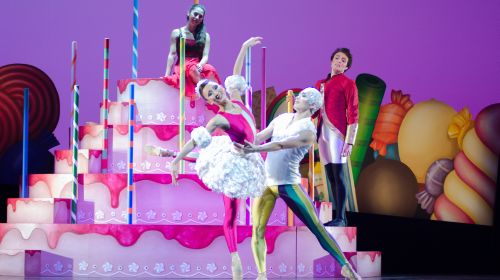 Dort gibt es dann auch endlich Farben – und was für welche. Mollérus zieht für das bonbonbunte Wunderland des zweiten Akts alle Register. Fernando lässt dazu eine ganze Schar Kinder als Bonbons und Mäuse über die Bühne wirbeln. Und er unterzieht den Reigen der Süßigkeiten einiger Aktualisierungen. Statt Kaffee und Tee wie im Original lässt er Softeis und Waffeln über die Bühne tanzen. So offenkundig modern wie mit dem Inhalt der Geschichte geht Fernando übrigens keineswegs mit dem Tanz um. Der bleibt in seinen Grundzügen weitgehend klassisch. Nur behutsam und außerdem noch sehr geschickt baut er moderne Elemente ein – etwa am Anfang, wenn auch auf Tischen und Stühlen getanzt wird. Die Compagnie glänzt durch hohe Motivation und Präzision. Einen ebenso beachtlichen Job macht unterdessen der junge Dirigent David Marlow, der dem Orchester hörbaren Elan vermittelt. An diesem Abend springen die Funken zwischen Bühne und Orchestergraben vielfach hin und her. Ein großer Spaß!