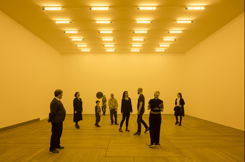 Sandra Badelt: Das stimmt. Er arbeitet nicht schwarz-weiß, aber er verwandelt uns alle in schwarz-weiß. Seine Arbeit funktioniert in der Ausstellung wie ein Epilog. Nachdem die Besucher durch die Ausstellung gegangen sind und die Malerei in Schwarz und Weiß erlebt haben, betreten sie ganz am Ende der Ausstellung Elíassons Rauminstallation „Room for one colour“. Die Installation bietet für das Publikum ein einzigartiges Transformationserlebnis. Das senfgelbe Monofrequenzlicht unterdrückt jede andere Farbe, auch unsere Hautfarbe und taucht somit den Besucher in Grautöne. Und das ist eine tolle Erfahrung, weil es alle Sinne anspricht und gleichzeitig hinterfragt, wie ich mich eigentlich selber erfahre. Es stellt auch die Frage, wie man die Wirklichkeit sieht. In der Installation muss jeder sein eigenes Sehen infrage stellen.