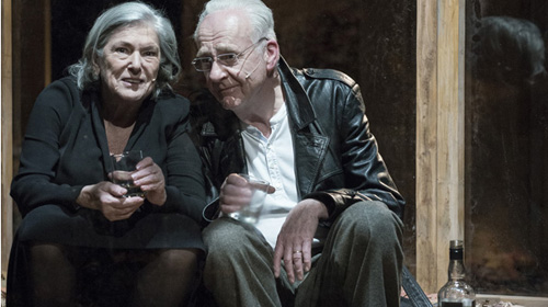 Langsame Bewegung, stille Musik. Überall liegen braune Blätter auf der Bühne verstreut. Es wird immer Herbst im Leben der beiden Alten bleiben. Sie hausen in ihrer Villa am See in der Schweiz, gerade haben sie ihren jungen Sohn verloren. Zu früh, zu sinnlos. Trauer und Schmerz überwältigen sie. Die Orientierung fehlt. Und dann steht da noch zwischen ihnen ein Stein. Granit mit Inschrift, Erinnerung, Fixpunkt im neuen Lebenseinerlei. Peter Carp inszeniert in Oberhausen die Novelle „Das Gartenhaus“ (1989) des renommierten Schweizer Autors Thomas Hürlimann, den Stücktext schrieb Stefanie Carp, das Bühnenbild baute Kaspar Zwimpfer – ein Gemeinschaftsprojekt also. Außerdem wollte der Intendant Carp einmal Margot Gödrös und Hartmut Stanke gemeinsam auf der Bühne sehen.