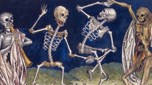Eine überaus vergnügliche Reise in den Tod bietet die Ludwig Galerie im Schloss Oberhausen mit ihrer „Vanitas Vanitatum!“-Ausstellung über Todesdarstellungen in der Frühen Neuzeit – obwohl die Erzeuger der Exponate dies wohl nicht so gemeint haben. Oder vielleicht doch? Was soll man davon halten beim Betrachten von „Tanz der Gerippe“ (Michael Wolgemut, 1493), wenn johlende Gebeine sich um eine winkende Leiche scharen, während eine Dame mittut, schon stark verwesend, die ihre Scham mit heraushängenden Gedärmen überdeckt? Gerahmt mit lateinischen Versen von Francesco Petrarca werden hier doch nicht nur die Verfallszustände des Leichnams dokumentiert – oder macht es etwa Sinn, dass das Gerippe im Grab immerhin noch mit einem unversehrten Arm winken kann?