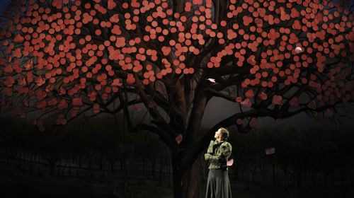 Dabei hat Regisseurin Cilli Drexel die Geschichte von Effi, die hoch hinaus will, elegant erzählt, mit ihren überzeugenden Schauspielern keine Längen erzeugt beim fröhlichen Weg vom Schaukelpferd in die Gruft. Im effizienten Bühnenbild, preiswert aber wirkungsvoll, spult sich das Leben derer von Briest und derer von Innstetten zwischen Provinz und Hauptstadt ab. Er ist Mitte 30 (also kein Heesters-Typ), hat die 17jährige geheiratet und sich damit ein „normales“ Generationsproblem ins Haus geholt. Er will Karriere machen, sie will hoch hinaus, nur die Liebe bleibt ein wenig auf der Strecke. Das nutzt der schicke Major, aber er zahlt auch freiwillig einen hohen Preis dafür. Nadja Robiné als wandlungsfähige Effi eher unfreiwillig. Als vom zentralen Baumgemälde (bei Fontane sind das Platanen) die Papierblätter fallen, stellt von Innstetten den Betrug fest, danach geht es bei Cilli Drexel ziemlich schnell. Scheidung, Verlust des Sorgerecht, Krankheit, Siechtum, Tod. Der gehörnte Beamtenadlige steht ziemlich blöd da mit seiner Ehre. Ein kleines Maskenintermezzo folgt, die Mimik erstarrt. Die Zeiten waren eben so. Heute sind sie anders, oder besser: anders unglücklich.