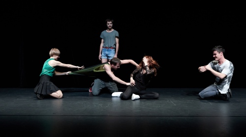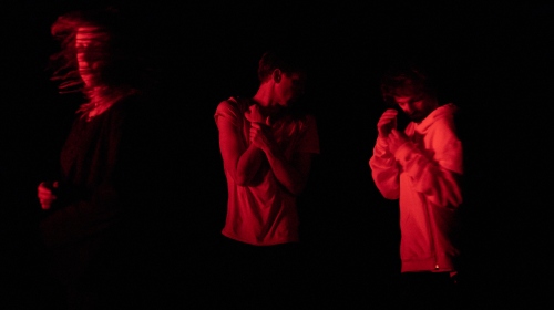 Die längste und intensivste Szene ist zugleich diejenige, die am unerbittlichsten an den Nerven des Zuschauers zehrt. Es ist stockfinster und beunruhigend still. Auf der Bühne bewegt sich ein Mann, dreht den Oberkörper in schnellem Rhythmus hin und her, ist dabei rot beleuchtet. Im Hintergrund ein schneller Herzschlag und ruheloses Rascheln. Minutenlang geht das so, bis eine zweite Person es dem Mann gleichtut. Irgendwann stehen alle sechs Tänzer auf der Bühne, tiefrot beleuchtet, drehen sich hin und her, hören abwechselnd auf, machen dann weiter. Wieder wird die „Musik“ lauter und lauter, und wenn man denkt, es ist vorbei, geht es von vorne los. Eine nervenzerreißende Unendlichkeit, in der es scheint, als wären wir im Kopf eines Serienmörders angekommen. Auch diese Szene verliert sich langsam und macht Platz für eine Frau im Pelzmantel, die auf dem Boden sitzt und redet. Über die Probleme in der Theaterszene, über Rollen, die man nicht spielen will. Dabei werden ihre Worte immer undeutlicher und sie entfernt sich vom Publikum, wird von Dunkelheit und Lärm verschlungen.