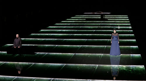 Das Publikum hockt, „angekettet“ wie Prometheus, auf der Tribüne und wird allen gängigen Rezeptionsmöglichkeiten beraubt, der Text ist nicht verständlich, die Musik kaum verifizierbar, die Augen von gleißendem Licht gequält, und was die Schar dort hundert Meter weit entfernt an Tätigkeiten verrichtet, entzieht sich geschickt den Blicken der Massen. Ein langes, leicht schräges Podest, das durch grüne Neon-Stäbe optisch Stufen vortäuscht und in der Unendlichkeit endet, ist der Schauplatz des Nichts, in dem der Menscherretter gelandet ist und jammert und erklärt und wütet und prophezeit, alles, ohne einmal die Kurvenhülle der Töne zu überziehen. Babylonisches Sprachgewirr für den einen, reiner Sprachklang für den anderen. Die Geschichte des geketteten Helden sollte man kennen, notwendig ist das jedoch nicht, wenn man sich nur auf das bewegungsarme Ritual und die Musik konzentriert.