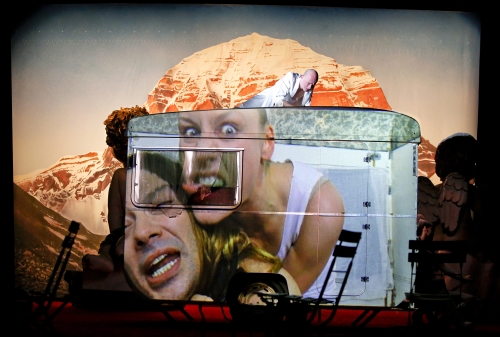 Denn ER betritt die Bühne. Tänzelnder Schritt, Chorhemd mit Stola, entrückter Blick: Björn Gabriel als Tartuffe inmitten der orgiastischen Szenerie, und Mariane (Merle Wasmuth), die Tochter des Hauses, Pernelle bringt es schnell auf den Punkt: Papa wird eine tragische Figur. Das ist er eigentlich schon, denn er will sie nicht nur mit dem Scharlatan verheiraten und hat dies der Tochter längst kausalmächtig verkündigt, er verschenkt auch noch Haus und Hof. Und ruft damit seine Gattin Elmire (Bettina Lieder) auf den Plan. Und die heckt einen einfachen Plan. Sie steigt mit dem sexbesessenen Schein-Geistlichen in den rot beleuchteten Wohnwagen und wird zur notgeilen Furie, während ihr Gatte entsetzt durch das Oberlicht (Kunststoff, klar) zusieht, auch das Publikum wird auf der Außenwand zu einem echten Castorfschen Voyeur. Björn Gabriel nimmt dafür psychopatische Züge und sogar einen Weinflaschenfist in Kauf, bevor er entlarvt seine letzte Karte ausspielen muss: Ihm gehört jetzt alles.