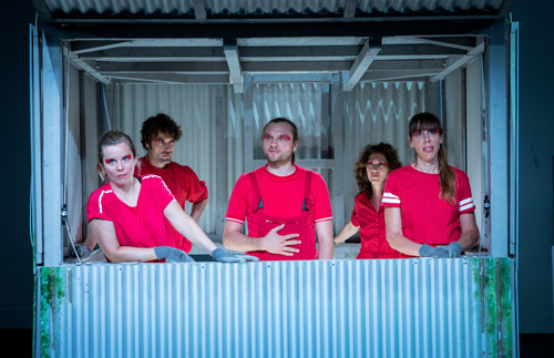 Wer jetzt langsam den Faden verliert – nein mit den Nornen hat das „Theater der Sorge“ jetzt nichts zu tun – braucht sich nicht fürchten: Der Komet schlägt während der Theaterperformance definitiv nicht ein. Es geht um das Theaterkollektiv EGfKA (Europäische Gemeinschaft für Kulturelle Angelegenheiten), das selbst ernannt postdramatische und klassische theatrale Formen mit entschiedenem gesellschaftlichem Engagement verbinden will. Im Ringlokschuppen spielen sie in „Anastrophe Now!“ mit Motiven aus Jura Soyfers Stück „Der Weltuntergang oder Die Welt steht auf kein’ Fall mehr lang“ von 1936, aber auch mit zeitgenössischen Versatzstücken aus literarischen Dystopien, Hollywood-Klassikern und diversen Science-Fiction-Serien. Im Weltall fehlt es an Licht, und so beginnt alles dunkel zwischen den Sternen, die Anklage, der Komet, die Statements. Das erste Break ist eine Tanzeinlage roter Figuren, die mit einer leicht roboterhaften Choreografie die Bühne füllen. Diese Performance wandert durch die Welt, per Video an den Bühnen-Wänden ist zu sehen, dass sie überall gefilmt wurde, in den großen Metropolen, in einsamen Gegenden, auf Straßen und Plätzen – weltweit, sie alle sind mysteriöse rote SpielerInnen, die zeigen, dass es auch ganz anders sein könnte. Die Erde wird zum Anastrophenschutzgebiet. Viele Statements wandern durch das Publikum, kommen aus dem Publikum, die Spieler sind im Publikum – das Publikum ist der von der Sonne ausgedachte Komet. Also doch kein Bakterium, diese dummen Kohlenstoff-Einheiten, mehr so Armageddon – ohne Bruce Willis. Das war mit dem Anthropozän doch anders gedacht, dachte ich, schließlich wurde dieses neue Erdzeitalter doch auf dem 35. Internationalen Geologischen Kongress in Kapstadt letztes Jahr bestätigt und ist für Mutter Erde eher eine Katastrophe.