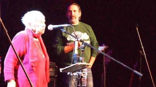 Auch in Bochum gibt es neben Liedern aus dem jüdischen oder italienischen Widerstand, Texten von Brecht oder pazifistischen Songs immer wieder Ansprachen über tagespolitische Turbulenzen. Etwa den Putsch in der Türkei und den Umgang mit den DeutschtürkInnen, der rassistische Affront gegen die Opfer des NSU oder die Hetze (und leider auch Gesetze) gegen Flüchtlinge. Ihr Sohn Yoram spricht die Verantwortung der Bundesrepublik an, die militärisch wie ökonomisch an so vielen Brandherden mitmischt und fordert: „Wir müssen diese Menschen willkommen heißen!“ Dafür gibt es lauten Applaus. Ja, ein Konzert mit Bejarano, mit „Microphone Mafia“ gleicht auch an diesem Abend einem Ritual gegen das Vergessen, gegen die Rückkehr von Nationalismus und Rassismus im großen Format. Denn auch dagegen kämpfen sie bei „Microphone Mafia“ – mit bodenständigem Rap und traditionellen Hymnen des Widerstands. Nach den Zugabe-Rufen tritt Bejarano noch einmal ans Mikro. „Jetzt singen alle mit“, fordert die 92-Järhige. Und im Saal stimmen alle mit an. Jung und alt. „Bella Ciao“, ein antifaschistischer Klassiker. Bei all dem neokonservativen Muff, ist das nur erfrischend und aktuell.