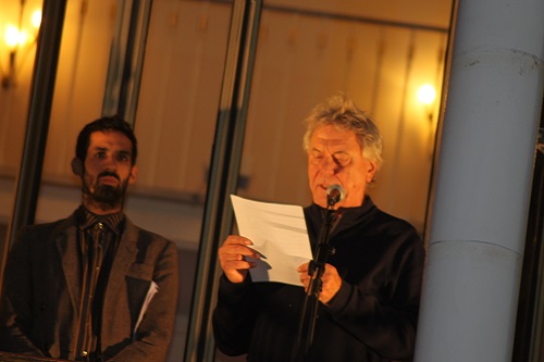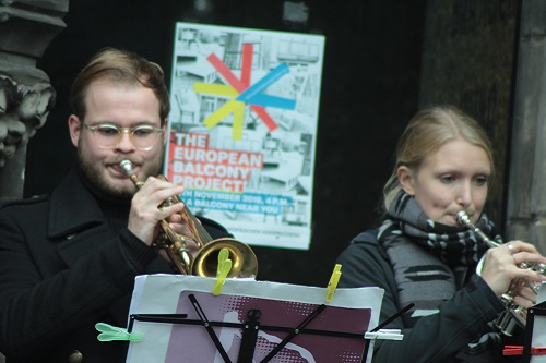 Eine Utopie haben Ensemblemitglieder des Schauspielhauses und Neu-Intendant Johan Simons wenige Minuten zuvor auch auf dem Balkon des Stadttheaters ausgerufen: „Es lebe die europäische Republik!“ Das Manifest, das sie in verschiedenen Sprachen vorlesen, stammt von der Politikwissenschaftlerin Ulrike Guérot und dem Schriftsteller Robert Menasse. Bundesweit wurde es um Punkt 16 Uhr proklamiert, mehr als 150 europäische Kulturinstitutionen haben an der medienwirksamen Inszenierung teilgenommen. Bilder und Tweets wurden fast zeitgleich über eine Homepage des Projekts verbreitet.