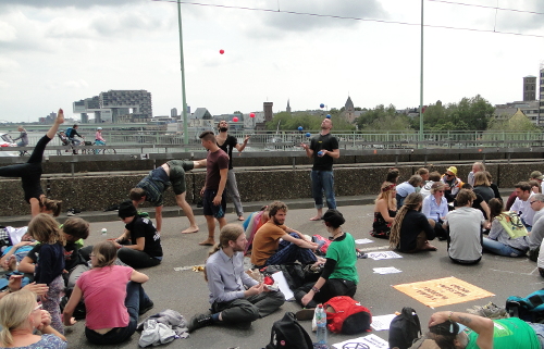 „Zivilen Ungehorsam“ machen die Schüler-Aktivisten von Fridays for Future für sich geltend, wenn sie während der Schulzeit lieber auf den Rathausplätzen deutscher Städte demonstrieren, um auf die Klimakrise aufmerksam zu machen, anstatt die Schulbank zu drücken – denn erst dadurch wird die Demonstration zum Streik. Ziviler Ungehorsam ist auch ein zentraler Teil der Strategie von Extinction Rebellion, einer ebenfalls noch recht neuen Gruppierung im Spektrum des Klima-Aktivismus. Auch in Köln gibt es eine Ortsgruppe, die nun erstmals mit einer größeren Aktion auf sich aufmerksam machte: Rund 250 Aktivisten hatten an einem Samstag, den 13. Juli, über mehrere Stunden die Fahrspur stadteinwärts der Deutzer Brücke blockiert. Das war den lokalen Medien sogar eine Eilmeldung wert.