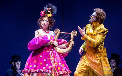 Der Niederländer Michiel Dijkema hat sie als phantastisches, farbenprächtig ausgestattetes Gespensterstück auf die Gelsenkirchener Bühne gebracht. Auch das Bühnenbild, inklusive der Riesenaugen, stammt vom Regisseur. Die spektakulären, historisierenden Kostüme, inklusive der Riesenzylinder der Studenten im Prolog, gehen hingegen auf das Konto von Julia Reindell. Zusammen gelingt ihnen ein Fest fürs Zuschauerauge. Wer sich als rockaffiner Steampunk auf das Original einlässt, begegnet so einigen Figuren wieder: Lindorf etwa, Hoffmanns sinistrem Gegenspieler, der unter anderen auch als Coppelius auftritt, einem unheimlichem Wesen in immer neuen, mysteriösen Gewändern und gesungen von Urban Malmberg mit dramatisch-kernigem Bariton. Klein Zaches, der Giftzwerg, bekommt auch einen Auftritt, wenngleich nur indirekt. Immerhin widmet Hoffmann dem „Kleinzack“ eine seiner zentralen Arien. Gesungen wird jener Hoffmann vom Schweden Joachim Bäckström, einem echten Glücksgriff mit schönem leuchtenden Tenor.