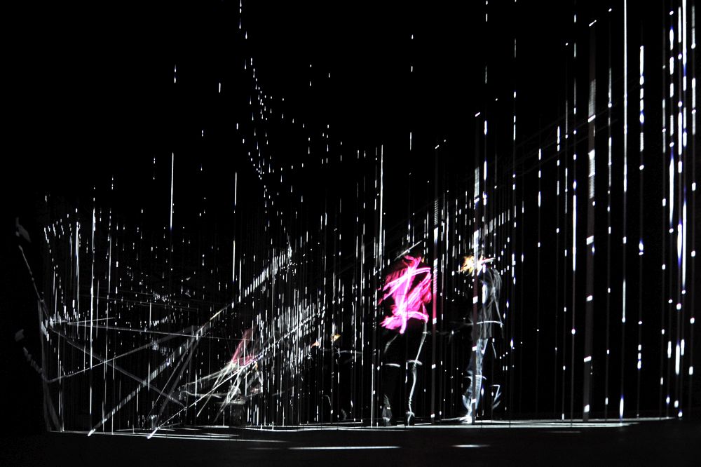 Den nächsten dunklen Raum erobern alle auf Socken. Wer schon eine Dekade früher in Unnas Lichtkunstmuseum gejubelt hat, der wird die audiovisuelle Gemeinschaftsarbeit „Plane Scape“ der vier Künstler Wolf Bittner (DE), Lyndsey Housden (UK), Yoko Seyama (JP) und Jeroen Uyttendaele (BE) wiedererkennen. Ich muss das verpasst haben. Ein dumpfer Grundton (Sechs-Kanal-Ton-Komposition) füllt den Raum, den ein wandernder Lichtstrahl leicht erhellt und den Blick auf ein Labyrinth aus tausenden Gummibändern öffnet. Immer wieder scheinen sich Wege zu öffnen und Konstrukte zu manifestieren, doch greifbar bleibt da nichts im Raum, durch den man sich überaus vorsichtig bewegen kann - ein außergewöhnliches Erlebnis von Orientierungslosigkeit trotz Beleuchtung in der Dunkelheit.
