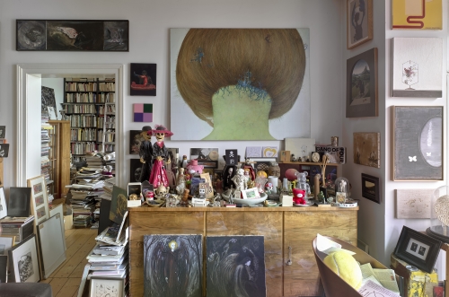 Treten Sie also ein in die „Collection of an Idiot“, die über 200 Einzelwerke schilderfrei aber nummeriert zeigt und so oft eine Lesebrille notwendig macht. Auf den ersten Blick erschlägt das Angebot an optischen Reizen, die Bilder werden hintereinander in offenen Kabinen präsentiert – keine Petersburger Hängung, aber ziemlich nah dran. Keisuke Yamamoto hat er gekauft, Felix Droese aus den berüchtigten 1980ern sehe ich, aber auch Jonas Burgert (klein keilt, 2014), der die psychotischen Ströme im Unterbewusstsein auf die Leinwand lenkt: Ein Hieronymus Bosch-Fischmonster scheint auf der Schulter des abgekämpften, jungen Künstlers zu hocken, nur das befleckte Waschbecken scheint nicht aus dem 15.Jahrhundert zu stammen. Und gleich nebenan ein schicker Kontrast mit dem stillen Snow-Girl (2009) von Tomoko Nagai, eine typische Arbeit mit zuckersüßer Märchen-Mangafigur.