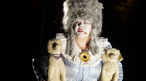 Die Palastarchitektur von Versailles ist sicherlich eine elegantere Kulisse als diese brachliegende Fläche vor der Rotunde, wo sich an diesem Mittwochabend etliche BesucherInnen mit Decken wärmen und an die Gitter drängen. Doch das höfische Schauspiel, das sie bei Dunkelheit bestaunen, hätte sicherlich auch den „Sonnenkönig“ Ludwig XIV. Gefallen. Das liegt nicht nur an den barocken Kostümen der DarstellerInnen, der beeindruckenden Lichtregie und den kurzweiligen Slapstick-Spielszenen.