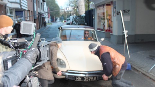 Wer Helge Schneider kennt, der weiß natürlich, dass diese Kurzinhaltsangabe schon jede Menge absurder Komik, schräger Figuren und alberner Momente verspricht. Während des Setbesuchs werden die Journalisten auch Zeuge einer solchen Szene, die vor dem Nagelstudio Jolie (Ähnlichkeiten mit berühmten Hollywoodschauspielerinnen sind wahrscheinlich rein zufällig) spielt, und in der Kommissar Schneider beinahe einen Unfall baut. Elli Hartmann (Schneider-Weggefährte Peter Thoms in Frauenkleidern) verlässt zufrieden den Maniküre-Salon, als sie beinahe von Schneiders antikem Citroën überrollt wird und ihm deswegen entrüstet einen Vogel zeigt. Auf der anschließenden Pressekonferenz fand Helge Schneider dann auch die passende Genreklassifikation für seinen neuen Kinofilm: Es wird ein „Film noir, allerdings in Farbe und auch mit Weiß. Vorbild für mich sind die Filme von Eddie Constantine, aber eigentlich nur die Plakate für seine Filme.“ Das kann ja was werden – nach den Sommerferien 2013 auf der großen Leinwand!