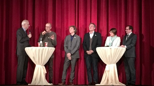 Doch der Abend hält eine weitere Überraschung bereit, als schließlich Schauspieler Peter Lohmeyer die Gesprächsrunde erweitert: „Ich bin völlig fertig, weil ich mir das nicht vorgestellt habe“, lobt er den Film von Kassenberg und Bürgin. „Ich komme eigentlich aus Bochum, Essen kenne ich auch, aber eigentlich nur den Weg vom Bahnhof hierher.“ Ein wenig neidisch sei er nun, obwohl er mittlerweile in Hamburg wohnt. Dabei war gerade die Stadt an der Alster bereits 2011 grüne Hauptstadt. „Aus Hamburg, aus Ljubljana, aus Stockholm und aus Kopenhagen eine grüne Hauptstadt zu machen, ist ja schon fast keine Kunst“, meint Pleitgen und wendet sich abschließend zu Oberbürgermeister Kufen und seiner Kollegin Raskob. „Aber was Sie hier geleistet haben, aus einer Schwerindustriestadt eine grüne Hauptstadt zu machen, ist wirklich eine reife Leistung.“